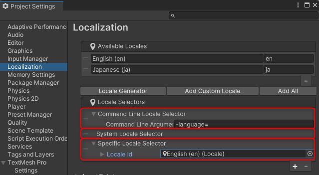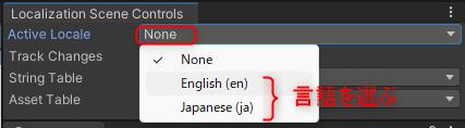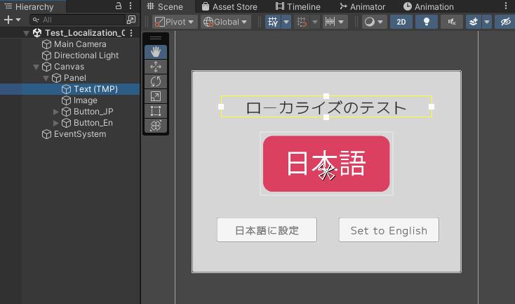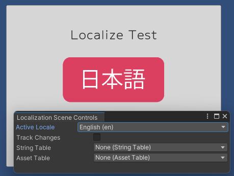 [Window ⇒ Asset Management ⇒ Localization Scene Controls] から "Localization Scene Controlsウィンドウ" を表示し、[Active Localeタブ] から表示した言語を選んで切り替わることを確認してください。